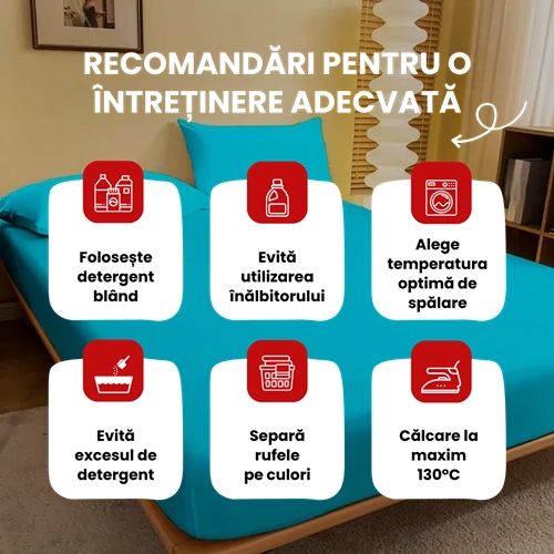 Respectand aceste instructiuni de utilizare si ingrijire, veti putea sa va bucurati de cearceaful cu elastic 160x200cm si de cele 2 fete de perna 50x70cm timp indelungat, mentinandu-i calitatea si aspectul impecabil.