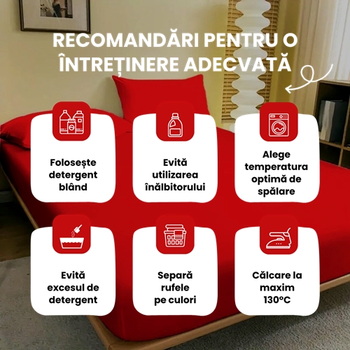 Respectand aceste instructiuni de utilizare si ingrijire, veti putea sa va bucurati de cearceaful cu elastic 180x200cm si de cele 2 fete de perna 50x70cm timp indelungat, mentinandu-i calitatea si aspectul impecabil.