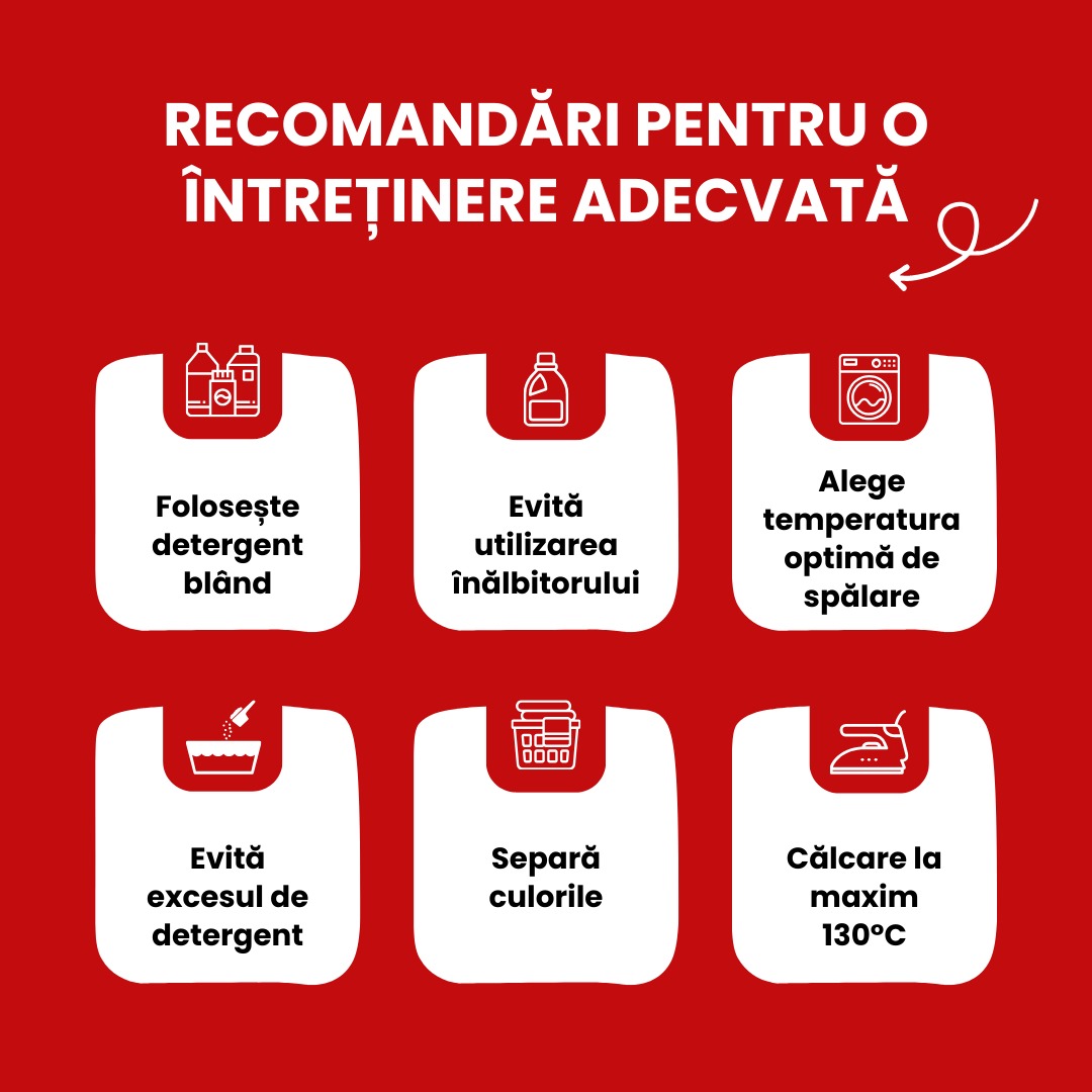 - Utilizeaza un detergent delicat si evitati inalbitorii agresivi pentru a pastra culorile vii si a mentine moaletea materialului.