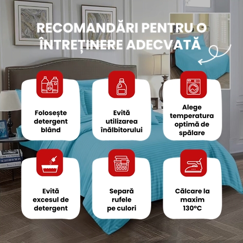 Lenjeria noastra de pat damasc policoton turcoaz cu 6 piese este usor de intretinut si curatat. Poate fi spalata la masina la temperaturi scazute, cu un detergent delicat, iar materialul de inalta calitate ramane moale si placut la atingere chiar si dupa multiple spalari.