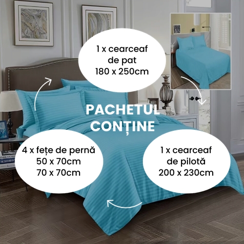 - Cearceaf de pat (230x250cm): Acest cearceaf generos se adapteaza perfect dimensiunilor saltelei tale, oferind o acoperire completa si un aspect impecabil in dormitorul tau.