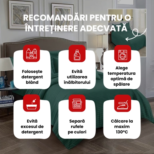 Lenjeria noastra de pat damasc policoton verde cu 6 piese este usor de intretinut si curatat. Poate fi spalata la masina la temperaturi scazute, cu un detergent delicat, iar materialul de inalta calitate ramane moale si placut la atingere chiar si dupa multiple spalari.