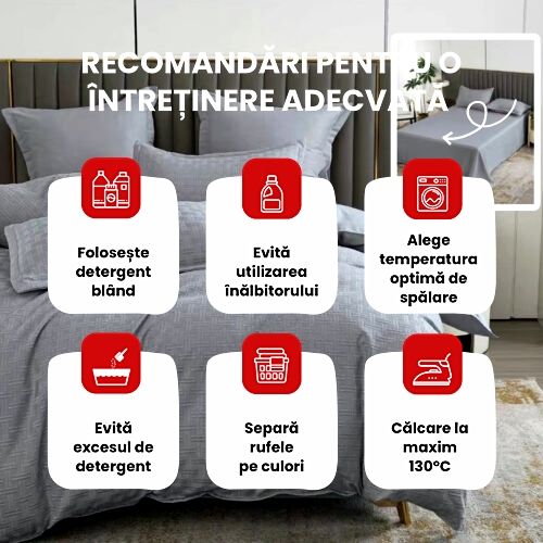 - Utilizati un detergent bland pentru a pastra calitatea materialului. Evitati inalbitorii duri, care pot afecta culorile si textura bumbacului satinat.