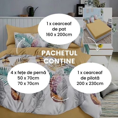 - Set complet de 6 piese: fiecare set include patru fete de perna (2 fete de perna 50x70cm si 2 fete de perna 70x70cm), un cearceaf cu elastic de 160x200cm si un cearceaf plic pentru pilota oferindu-va un ansamblu complet pentru a va inconjura in confort deplin.