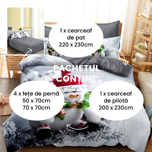 Lenjerie de pat de Craciun, finet, 6 piese, 3D, fabricata la Pucioasa, in Romania