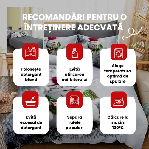 - Design tematic de Craciun: Imprimeurile de Craciun, care includ motive traditionale si moderne, sunt perfect potrivite pentru a aduce spiritul sarbatorilor chiar in dormitorul tau. De la fulgi de zapada eleganti pana la culorile vibrante de sarbatoare, aceasta lenjerie transforma fiecare seara intr-un moment special, amintindu-ti de bucuria si magia Craciunului. Adauga un plus de veselie si caldura decorului tau, creand un ambient plin de farmec pentru tine si familia ta.