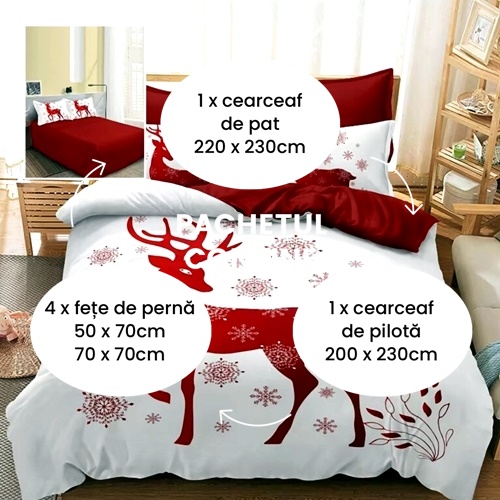Lenjerie de pat de Craciun, finet, 6 piese, 3D, fabricata la Pucioasa, in Romania