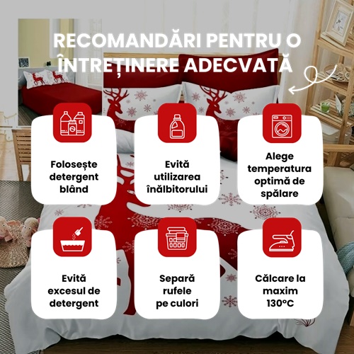 - Design tematic de Craciun: Imprimeurile de Craciun, care includ motive traditionale si moderne, sunt perfect potrivite pentru a aduce spiritul sarbatorilor chiar in dormitorul tau. De la fulgi de zapada eleganti pana la culorile vibrante de sarbatoare, aceasta lenjerie transforma fiecare seara intr-un moment special, amintindu-ti de bucuria si magia Craciunului. Adauga un plus de veselie si caldura decorului tau, creand un ambient plin de farmec pentru tine si familia ta.