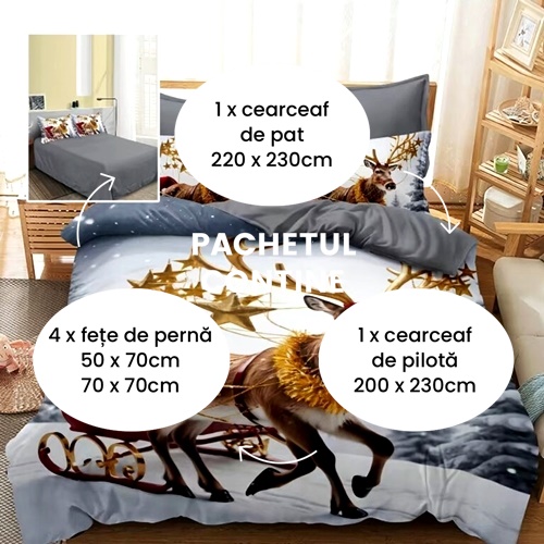 Lenjerie de pat de Craciun, finet, 6 piese, 3D, fabricata la Pucioasa, in Romania