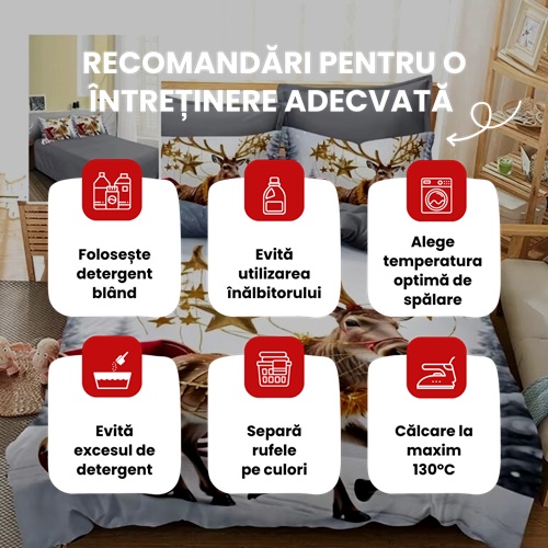 - Design tematic de Craciun: Imprimeurile de Craciun, care includ motive traditionale si moderne, sunt perfect potrivite pentru a aduce spiritul sarbatorilor chiar in dormitorul tau. De la fulgi de zapada eleganti pana la culorile vibrante de sarbatoare, aceasta lenjerie transforma fiecare seara intr-un moment special, amintindu-ti de bucuria si magia Craciunului. Adauga un plus de veselie si caldura decorului tau, creand un ambient plin de farmec pentru tine si familia ta.