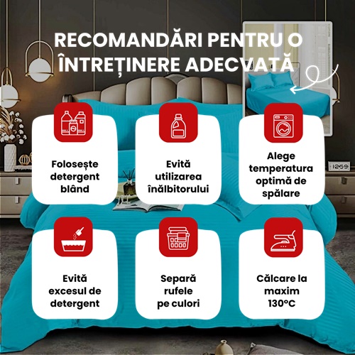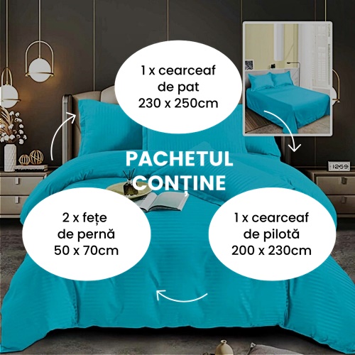 Nuanta bleu aduce un aer proaspat in orice decor de dormitor, fiind usor de integrat in camere cu tonuri neutre sau pastelate. Aceasta lenjerie este perfecta pentru cei care doresc sa adauge un strop de culoare subtila si o nota de liniste in incapere, fiind o alegere ideala pentru un somn odihnitor.