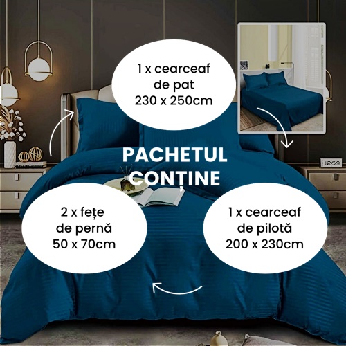 Setul contine 4 piese esentiale: un cearceaf de pat generos, cu dimensiuni de 230x250cm, ideal pentru a se potrivi perfect pe paturi duble, un cearceaf de pilota de 200x230cm ce imbraca pilota cu eleganta, si doua fete de perna de 50x70cm, toate piesele fiind create pentru a asigura un somn linistit si odihnitor. Lenjeria este produsa in Pucioasa, recunoscuta pentru traditia si calitatea sa in fabricarea textilelor, ceea ce garanteaza un produs de inalta clasa.