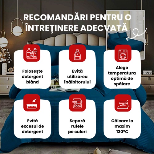 Transforma dormitorul tau intr-un spatiu elegant si confortabil cu aceasta lenjerie de pat dublu, confectionata din damasc policoton de inalta calitate. Materialul combinat din bumbac si poliester ofera o textura moale si placuta la atingere, asigurand totodata o durabilitate extinsa. Lenjeria este disponibila intr-o nuanta sofisticata de bleumarin, care adauga un aer rafinat si modern oricarui decor.