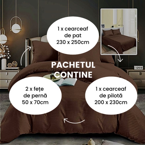 Lenjeria de pat in nuanta de maro este alegerea perfecta pentru cei care doresc sa aduca un plus de rafinament si caldura in dormitorul lor, fiind potrivita atat pentru uz personal, cat si pentru a fi oferita cadou cu ocazii speciale. Datorita materialului de calitate si a designului elegant, aceasta lenjerie de pat transforma orice noapte intr-o experienta de relaxare completa.