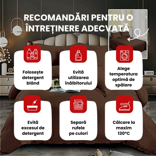 Produsa in Pucioasa, aceasta lenjerie de pat poarta garantia calitatii recunoscute a textilelor fabricate in Romania. Atent lucrata si finisata, aceasta lenjerie iti asigura nu doar un confort deosebit, ci si o rezistenta de lunga durata. Materialul este usor de intretinut, avand proprietati antistatic si anti-sifonare, astfel incat sa te bucuri de un pat mereu aranjat si confortabil.