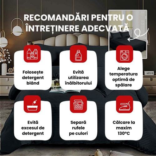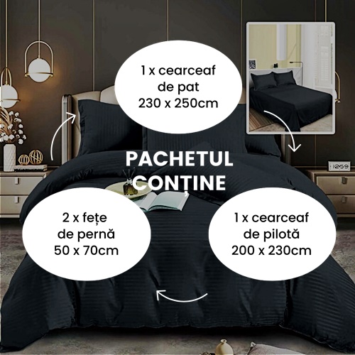 Aceasta lenjerie de pat este ideala pentru cei care cauta sa imbine functionalitatea cu stilul, oferind un echilibru perfect intre confort si estetica. Fie ca doresti sa-ti transformi dormitorul sau sa faci un cadou deosebit, acest set de lenjerie neagra este o alegere excelenta pentru un decor modern si elegant.