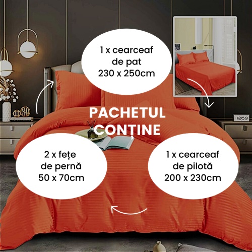 Culoarea portocalie vibranta aduce o atmosfera calda si vesela in dormitor, stimuland senzatia de confort si revitalizare. Este ideala pentru cei care doresc sa creeze un spatiu relaxant dar plin de personalitate. Fiind realizata in Pucioasa, un oras cu traditie in productia textilelor de calitate, aceasta lenjerie reflecta atentia la detalii si standardele inalte de fabricatie.
