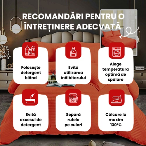 Lenjeria este usor de intretinut, avand o rezistenta remarcabila la spalari repetate, mentinandu-si culorile vibrante si textura fina in timp. Materialul este respirabil, asigurand un somn placut in orice sezon, fie ca este vorba de noptile calduroase de vara sau cele racoroase de iarna.