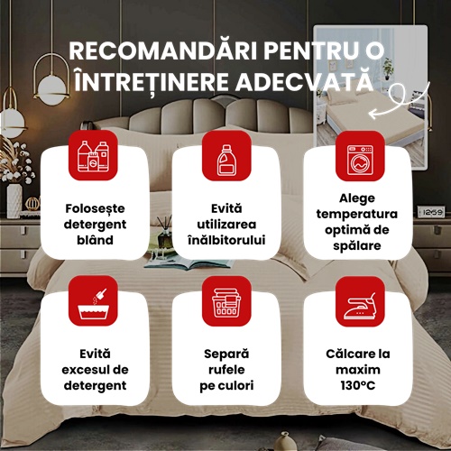 Lenjeria de pat bej este perfecta pentru un dormitor decorat in tonuri naturale si calde. Aceasta nuanta subtila si neutra aduce un plus de confort vizual si se potriveste de minune oricarui stil de amenajare interioara, oferind un aspect relaxant si primitor.