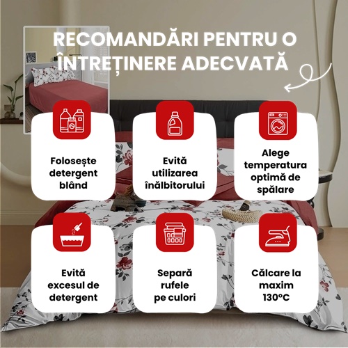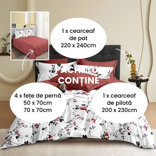 Cu un design floral modern, in nuante de rosu si negru pe un fundal alb, aceasta lenjerie de pat adauga un contrast puternic si un aer sofisticat in dormitorul tau. Fabricata din finet de calitate, lenjeria ofera un confort deosebit si este usor de intretinut. Cele sase piese includ un cearceaf de pat, unul pentru pilota si patru fete de perna, oferindu-ti un aranjament complet si stilat pentru un pat matrimonial.