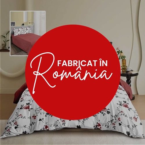 Lenjerie de pat dublu, finet, 6 piese, cearceaf pat 220x240cm, cearceaf pilota 200x230cm, 2 fete de perna 50x70 si 2 fete de perna 70x70cm, Pucioasa - Flori Rosii si Negru