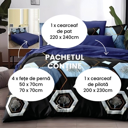 Lenjerie de pat dublu, finet, 6 piese, cearceaf pat 220x240cm, cearceaf pilota 200x230cm, 2 fete de perna 50x70 si 2 fete de perna 70x70cm, Pucioasa - Hexagoane Albastre