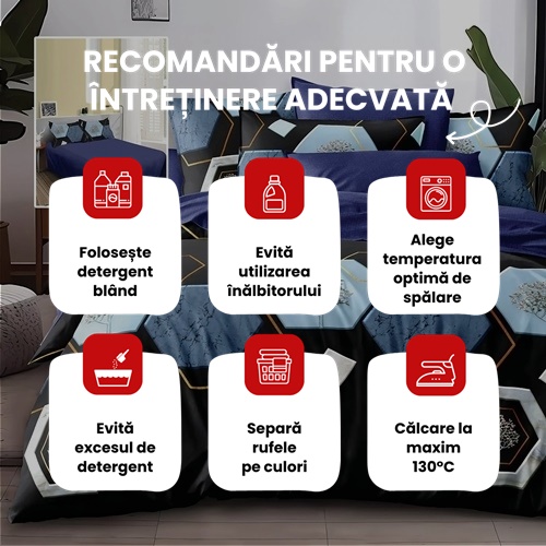 Aceasta lenjerie de pat cu model geometric de hexagoane albastre si detalii rafinate transforma dormitorul intr-un spatiu modern si sofisticat. Finetul asigura un confort deosebit, iar cele sase piese din set (cearceaf de pat, cearceaf de pilota si patru fete de perna) ofera un aranjament complet si estetic. Este o alegere potrivita pentru cei care isi doresc un decor aparte, ce imbina simplitatea cu eleganta.