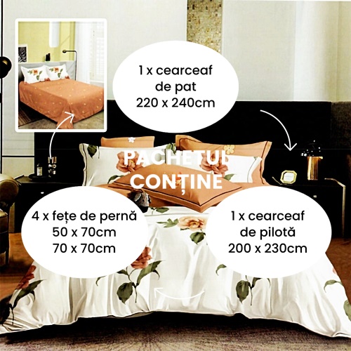 Lenjerie de pat dublu, finet, 6 piese, cearceaf pat 220x240cm, cearceaf pilota 200x230cm, 2 fete de perna 50x70 si 2 fete de perna 70x70cm, Pucioasa – Model trandafiri teracota