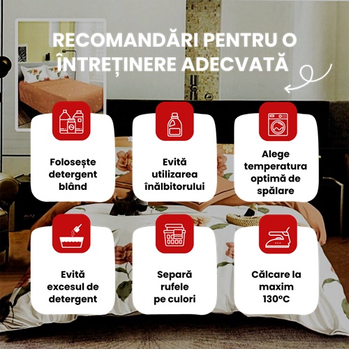 Produsa in Pucioasa, aceasta lenjerie de pat impresioneaza prin calitatea materialului si durabilitatea imprimeului. Culorile vibrante isi pastreaza intensitatea chiar si dupa multiple spalari, iar tesatura ramane moale si fina la atingere. Intretinerea este usoara, iar lenjeria isi mentine aspectul impecabil pentru o lunga perioada de timp.