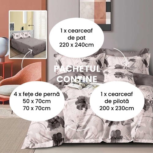 Lenjerie de pat dublu, finet, 6 piese, cearceaf pat 220x240cm, cearceaf pilota 200x230cm, 2 fete de perna 50x70 si 2 fete de perna 70x70cm, Pucioasa - model floral gri