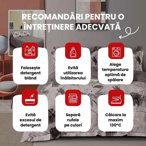 Durabilitatea materialului este garantata de fibrele de inalta densitate, care pastreaza textura si intensitatea culorilor chiar si dupa multiple spalari. Este usor de intretinut si nu necesita calcare frecventa, fiind o alegere practica si stilata pentru orice dormitor.