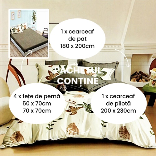 Lenjerie de pat dublu, finet, 6 piese, cearceaf pat cu elastic 180x200cm, cearceaf pilota 200x230cm, 2 fete de perna 50x70 si 2 fete de perna 70x70cm, Pucioasa – model frunze bej-verzi