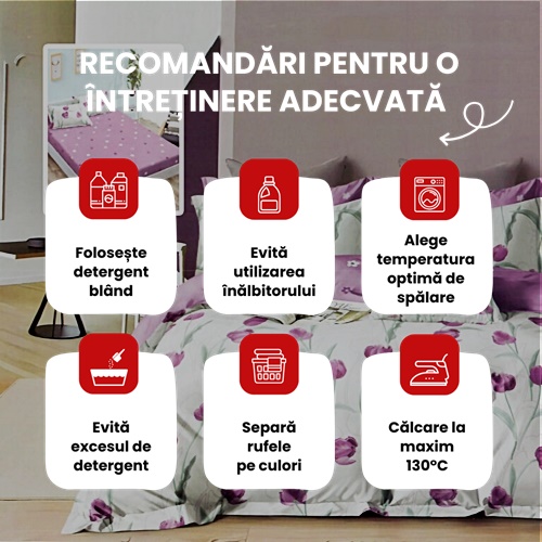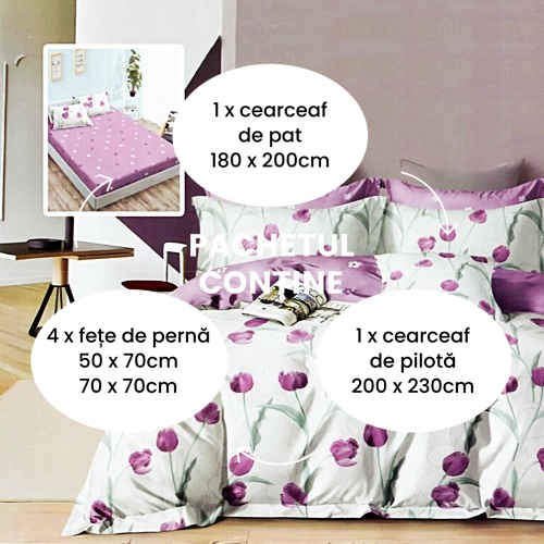 Lenjerie de pat dublu, finet, 6 piese, cearceaf pat cu elastic 180x200cm, cearceaf pilota 200x230cm, 2 fete de perna 50x70 si 2 fete de perna 70x70cm, Pucioasa – model lalele mov