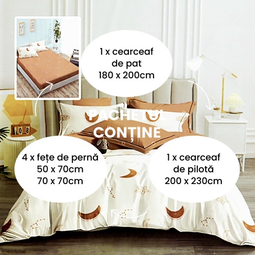 Lenjerie de pat dublu, finet, 6 piese, cearceaf pat cu elastic 180x200cm, cearceaf pilota 200x230cm, 2 fete de perna 50x70 si 2 fete de perna 70x70cm, Pucioasa – model luna si stele pe bej