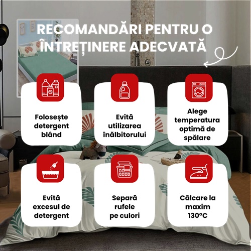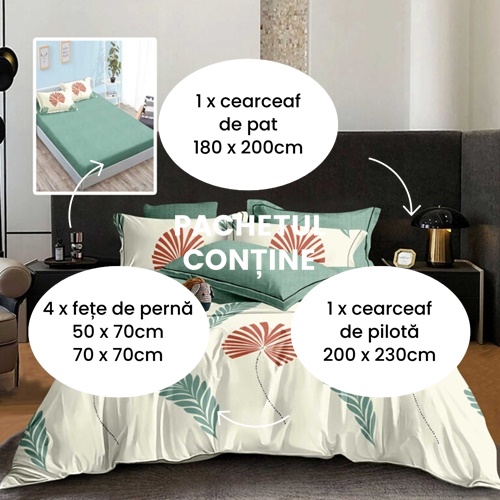 Aceasta lenjerie de pat din finet impresioneaza prin imprimeul sau floral echilibrat, cu frunze mari verzi si flori discrete in tonuri de roscat pe un fundal alb. Designul sofisticat adauga eleganta si stil dormitorului, creand o atmosfera relaxanta. Materialul moale si respirabil garanteaza un somn odihnitor, iar cearceaful de pat cu elastic, in nuanta verde pastel, fixeaza lenjeria perfect pe saltea. Fetele de perna completeaza armonios acest set elegant si primitor.