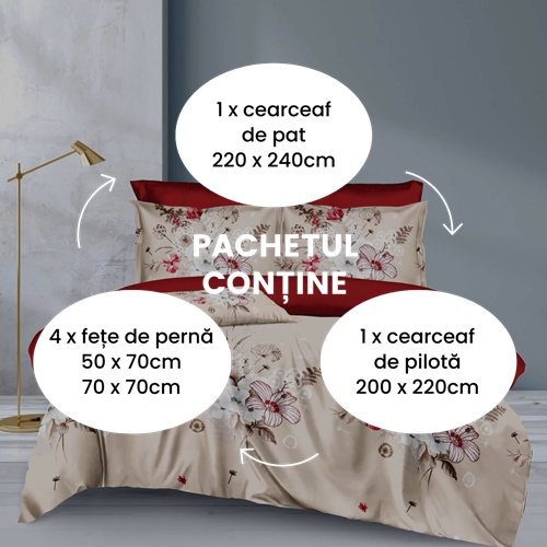 - Set complet de 6 piese: fiecare set include patru fete de perna (2 fete de perna 50x70cm si 2 fete de perna 70x70cm), un cearceaf de pat si un cearceaf pentru pilota, oferindu-va tot ceea ce aveti nevoie pentru a va inconjura intr-un confort absolut si pentru a transforma dormitorul intr-o oaza de relaxare.