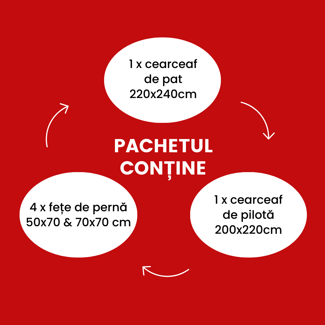 - Set complet de 6 piese: fiecare set include patru fete de perna (2 fete de perna 50x70cm si 2 fete de perna 70x70cm), un cearceaf de pat si un cearceaf pentru pilota, oferindu-va tot ceea ce aveti nevoie pentru a va inconjura intr-un confort absolut si pentru a transforma dormitorul intr-o oaza de relaxare.